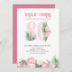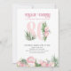 Invitación a la fiesta de cumpleaños número 80 decorada con hojas de palma tropicales, flores de protea rosa y un coco. Un diseño sutil y elegante con acuarelas florales en tonos rosa y verde. Perfecto para la celebración del 80 cumpleaños, fiesta de luau o fiesta de té en el jardín.