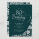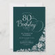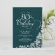 Sencilla y elegante invitación a la fiesta de cumpleaños número 80 en verde esmeralda y plata. Diseño elegante con rosas, Relieve metalizado falso plateado y tipo de letra de guión tipográfico. La carta de invitación a la moda es perfecta para una elegante celebración de cumpleaños femenina. Personaliza con tus propios detalles. Se puede personalizar a cualquier edad. Invitaciones Zazzle impresas o una plantilla imprimible digital de descarga instantánea.