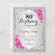 80.ª Invitación de cumpleaños. Elegante diseño floral en plata y rosa. Presenta rayas de plata purpurina falsas, letra de guión elegante rosa y confeti. Perfecto para una fiesta de cumpleaños glam.