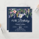 Elegante invitación de 90 años de color azul marino y flores silvestres que puedes personalizar con los detalles de tu fiesta.