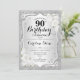 Invitación al cumpleaños 90. Diseño elegante en blanco y plateado. Presenta rayas plateadas purpurinas falsas, letra de guión elegante de rosas blancas y confeti. Perfecto para una fiesta de cumpleaños glam.