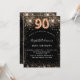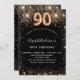 Una invitación moderna, elegante y glamurosa para una fiesta de cumpleaños número 90. Un fondo negro decorado con finos purpurinas dorados, chispas. El nombre está escrito con una escritura de estilo con letras a mano moderna. Personalice y agregue los detalles de su fiesta. El número 90 se escribe con un tipo de letra, guión.