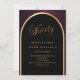 Una elegante invitación de cumpleaños número 90. Un fondo negro y borgoñoso con un arco dorado en la parte delantera.