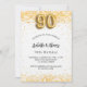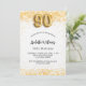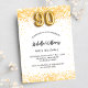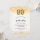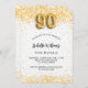 Para una elegante fiesta de cumpleaños número 90. Un fondo blanco moda. Decorado con purpurinas de oro falso, chispas. Personalice y agregue un nombre, edad y detalles del fiesta. El nombre se escribe con un guión de estilo con letras a mano. Número 90 con tipo de letra de estilo globo.