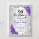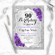 Invitación al cumpleaños 90. Diseño elegante en plata y morado. Incluye franjas finas purpurinas de plata, rosas púrpura tipo de letra de guión elegante y confeti. Perfecto para una fiesta de cumpleaños glam.