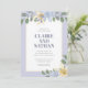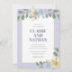 El diseño presenta elegantes acuarelas florales en diferentes tonos de violeta polvorienta, azul y dorado. El diseño también presenta varios tipos de vegetación y ramas de verduras y moradas. La parte trasera de esta sencilla y elegante invitación es una sombra más profunda de morado.