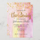 Esta invitación, tan de moda, tiene un fondo de color rosa y unas letras de oro falsas y un confetti que caen al fondo.