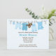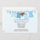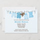 Esta tierna invitación de Baby Shower incluye ropa azul para bebé y un oso de peluche y una manta para bebé en un tendedero. Esta moderna y elegante invitación a la ducha es perfecta para cualquier madre. Algunos elementos de esta tarjeta © BabyStar Design