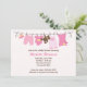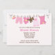Esta bonita invitación de Baby Shower incluye ropa de bebé rosa y un oso de peluche y una manta para bebés en un tendedero. Esta moderna y elegante invitación a la ducha es perfecta para cualquier madre. Algunos elementos de esta tarjeta © BabyStar Design