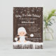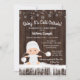 Invitación a baby shower Baby it's cold outside con un adorable bebé vestido con un traje de nieve blanco y sombrero sobre un fondo rústico de madera y copos de nieve. Estas invitaciones de baby shower de copos de nieve invernales se personalizan fácilmente para su evento simplemente añadiendo sus detalles. Este diseño funciona bien para una invitación de revelación de género de copo de nieve o invierno.