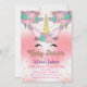 Bonito como puede ser invitación de Unicorn Baby Shower. Cuenta con nubes, fuentes de Relieve metalizado de oro falsas, acentos y espalda con flores verde azuladas, púrpura y rosa.