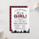 It's a Girl! Esta invitación estampada de yeguas en el frente y el reverso es perfecta para una ducha de bebé de cemento para celebrar la llegada de una niña. Incluye un patrón de comprobación de búfalo rojo y negro y silueta de árbol. Ideal para un fiesta en otoño o invierno, un leñador, una aventura o una temática al aire libre o un lavabo con vestimenta de franela.