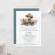 Adorable niñito vaquero sentado, con su juguete de caballo relleno decora la parte superior de esta invitación a la ducha de bebé. Un fondo blanco sólido en la invitación tiene un texto azul personalizado federal limpio listo para personalizar para su evento. Bonita invitación a la ducha de bebé con una bengala occidental.