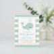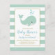 Esta tarjeta postal con invitación a la ducha para bebés, dulce y neutra, cuenta con una hermosa menta de ballena verde salpicando gotas de agua azules. Las palabras "Baby Shower" y el nombre de personalizable de la futura madre aparecen en el tipo de letra azul de escritura. Más allá del falso marco rectangular de oro se encuentra un fondo de rayas verdes y blancas de menta. Ideal para bañarse bajo el mar o para bañarse en la playa.