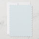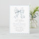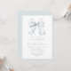 La invitación a la ducha mínima para bebés, que incluye un elegante arco azul y un fondo y bordes de vieiras.