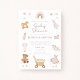 Esta acogedora ducha de bebé es la elección perfecta para los futuros padres que aprecian los tonos suaves y naturales y una estética cálida y acogedora. Con delicados ilustraciones de un oso de peluche, conejito, carruaje para bebés, globo y juguetes de madera, esta invitación aporta un encanto dulce y artesanal a tu celebración. La paleta de colores pastel neutros (beige suave, rubor y marrón) es ideal para cualquier género. Perfecto para duchas de bebé rústicas, minimalistas o modernas, esta invitación le da un toque elegante y acogedor a su día especial. ¡Haz que tu ducha de bebé sea verdaderamente memorable con este adorable diseño de boho!