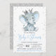 Muchacho elefante, invitación a la ducha de bebé con adorable elefante bebé con corona de bonito de plata en un fondo purpurina de plata. Esta invitación a la ducha de bebé de elefantes se personaliza fácilmente para tu evento. Puede quitar el fondo del purpurina trasero y agregar el color que desee.