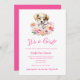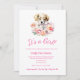 Un lindo cachorro y encantadoras flores rosadas invitan a Baby Shower.