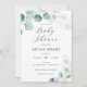 Invitación de Baby Shower que incluye una corona acuarela de hojas de eucalipto y vegetación. Personalizar con los detalles del evento para celebrar a la madre.