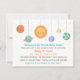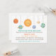 Una invitación a cortar la ducha de bebé con garabatos del sol y planetas incluyendo el planeta Tierra con nubes como cejas de ojos. El telón de fondo de las pequeñas estrellas sobre un fondo blanco. ¡Una forma maravillosa de dar la bienvenida al pequeño al mundo! Personalice los detalles de la ducha de bebé en las plantillas de texto proporcionadas.