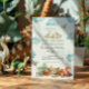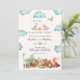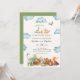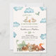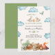 Invitación temática de dinosaurio para baby shower "Un bebé varón está a punto de eclosionar" con elementos de diseño colorido de acuarela.