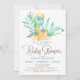Invitación a la ducha de bebé de un niño dinosaurio. Invite presenta dinosaurios de bebé azules y verdes con hojas verdes. La parte posterior de la invitación presenta un patrón de corazón blanco sobre fondo azul del bebé.