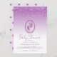 Fije el tono para una celebración mágica con esta invitación impresa a la ducha de bebé, que incluye un brillante diseño falso de goteo de purpurina púrpura y adorable emblema de pies de bebé. El fondo de lavanda ombré y el respaldo del pasador de seguridad de coordinación crean una vibración caprichosa pero glam. El personalizable completo con los detalles de la ducha es perfecto para una ducha con motivos púrpura o purpurina.