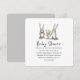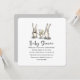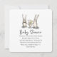 Ilustracion familiar de conejo con escritura moderna a mano con invitación a la ducha de bebé, con un suave color gris de la tarjeta.
