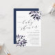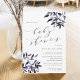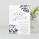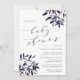 La rústica y elegante invitación a la ducha para bebés cuenta con ricas letras en negro en bloques de moda y cursiva con acentos de caligrafía, con rociadores de color de agua que caen en las esquinas en los tonos de cosecha de otoño de ciruela morada y azul de medianoche. Las invitaciones a la ducha de bebé de moda revertirán a azul marino sólido.