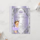 Invitación a baby shower púrpura y plata con dulce bebé niña que lleva un precioso tutú lavanda púrpura y corona sobre un fondo de remolino lavanda y plata. Esta linda invitación a baby shower lavanda y plata se personaliza fácilmente para su evento simplemente agregando los detalles del evento.