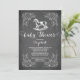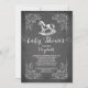 Chalkboard chalets vintage con cabinas neutras para bebés invitaciones colocadas sobre un fondo negro de pizarra. Gire nuestro vintage caballo de mecedora invitándolo a ver la parte de atrás para un toque especial. Disponible en nuestra tienda en una variedad de colores para una ducha de bebé para chicas, una ducha de bebé para niños o una ducha de bebé neutra en cuanto a sexo.