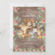 Chicas íntimos diseño de ducha de bebé con el oso más dulce sentado sobre un trozo de árbol rodeado de ciervo, mapache, ardilla, zorro, alce y zorro. Enmarcado con hojas de color verde natural de agua sobre un fondo rústico de madera. Haga girar nuestra invitación para ver una hoja verde a juego para un toque especial.