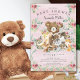 El diseño de la ducha de bebé tiene el oso más dulce sentado sobre un trozo de árbol rodeado de ciervo, mapache, ardilla, zorro, alce y zorro. Enmarcado con hojas de color verde natural de agua sobre un fondo color de agua rosado. Haga girar nuestra invitación para ver una hoja verde a juego para un toque especial.