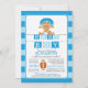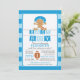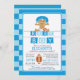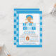 Moderna invitación a la ducha de bebé de fútbol con un lindo bebé afroamericano usando pañal y casco con un juego de fútbol en un fondo azul y azul claro con acento futbolístico y pancartas inclinadas. Dé la vuelta a la ducha de bebé de nuestros deportistas para ver el resultado de un toque especial. Perfecto para una ducha de niños con temática deportiva.