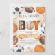 Celebra la llegada de tu pequeño con esta invitación de Baby Shower de Sports Balls Boy. Este diseño presenta gráficos deportivos temáticos que incluyen pelotas de baloncesto, pelotas de béisbol, pelotas de fútbol y balones de fútbol colocados sobre un fondo acuático.
