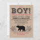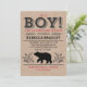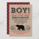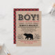 Celebre con estilo con esta invitación a la ducha de bebé de leñador. Incluye letras atrevidas, un oso entre follaje con un patrón de manchas de búfalo en la espalda. Es un tema adorable para tu ducha de bebé.