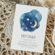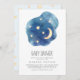 Esta invitación a la luna y a las estrellas de la ducha de bebé es perfecta para una simple ducha de bebé. El diseño moderno y caprichoso presenta una forma de nubes acuarela azul marino con una luna de barrio amarilla y estrellas.