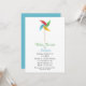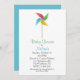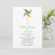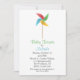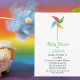 Invitación a la ducha de bebé blanca, con un colorido molino de juguete, en la parte superior. Personalice todos los campos de texto para su evento de ducha de bebé.