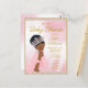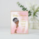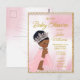 Invitación a baby shower de princesa negra con una adorable bebé princesa con cabello afro lindo con corona de diamantes y capa sobre un hermoso fondo rosa y dorado. Esta invitación postcard para baby shower de princesa se personaliza fácilmente con los detalles de su evento.