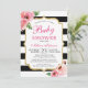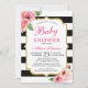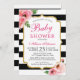 ・ Floral Baby Shower Rubor en franjas blancas negras con plantilla de invitación a cuadros de Purpurina dorado. Añade texto personalizado a la parte posterior para proporcionar cualquier información adicional necesaria para los invitados.