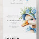 la historia de un hito alegre, muy primer cumpleaños, una celebración envuelta en amor, calor y un toque de fantasía. El diseño se centra alrededor de una gallina de los huevos encantadora, ilustrada con cariño como si se hubiera sacado de las páginas de un libro infantil muy querido. No es cualquier ganso —es "una gallina de los huevos", vestido para un fiesta con un gorra a rayas y una corona floral, aferrándose orgullosamente a un globo azul. Su expresión es de ojos abiertos, inocente y llena de personalidad, igual que un niño de un año descubriendo el mundo.