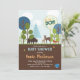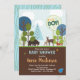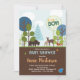 Una colorida invitación a la ducha de bebé de un bosque con animales del bosque y árboles coloridos con un fondo con motivos de grano de madera.