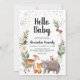 Invitación de Baby Shower de Woodland Animals con un venado bebé, zorro, oso y búho, acentuado con vegetación de invierno y confetti. La invitación perfecta para su evento tan especial. Todo el texto es completamente editable.