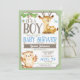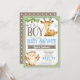 Invitación a la ducha para bebés de ciervos y lechones de Woodland. Presenta patas, búhos, flores y mariposas. Los colores son azul, marrón y verde.