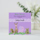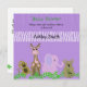 Una dulce colección de animales del zoo. Un mono bobo, una jirafa marrón rosa y chocolate, un elefante rosa suave y un oso de koala adorable de color toffee. Una hilera de viñas verdes delante de ellas sobre un fondo de huellas de animales salvajes púrpura. Personalizar con toda la información de ducha que desee.