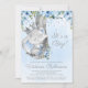 Muchacho elefante con una invitación a la ducha de bebé con un lindo elefante bebé con corona de príncipe y baúl sobre un fondo de color azul. Esta tierna invitación a la ducha para bebés de elefantes se personaliza fácilmente con los detalles de tu evento en el estilo de letra que prefieras.