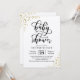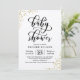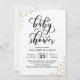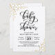 La elegante ducha de bebé está decorada con una mezcla de confetti falso purpurina de oro y una moderna fuente caligráfica.