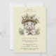 Un fantástico ratón de bosque con champiñones y vegetación, invitación a la fiesta de primer cumpleaños. Neutralidad de género para chica o niño.
