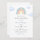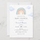 Invitación de Baby Shower con un arcoiris y nubes de color multicolor. Personalice su información o haga clic en "hacer clic en el personalizar más adelante" para ajustar el tipo de letra, el tamaño y el color.