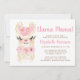 Sencilla y dulce invitación a la ducha de bebé con un ilustracion acuarela de una llama de bonito y niñita con flores rosadas y purpurina de oro. "Llama Mama!" y el nombre de la futura madre están en un divertido guion rosado y se puede personalizar si la ducha es para un niño o niña y otros detalles en la tipografía de oro.